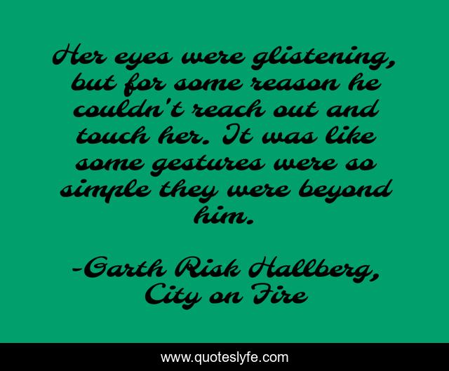 This page presents the quote "Her eyes were glistening, but for some reason he couldn't reach out and touch her. It was like some gestures were so simple they were beyond him.". Author of this quote is Garth Risk Hallberg, City on Fire. This quote is about city-on-fire, comfort, crying, garth-risk-hallberg,.