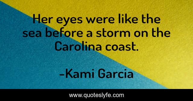 This page presents the quote "Her eyes were like the sea before a storm on the Carolina coast.". Author of this quote is Kami Garcia. This quote is about love, beautiful-creatures, love-story, magic, hauntingly-beautiful, affection,.