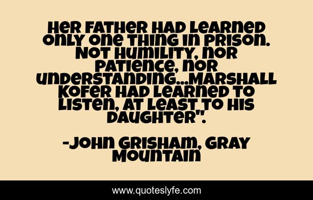 This page presents the quote "Her father had learned only one thing in prison. Not humility, nor patience, nor understanding...Marshall Kofer had learned to listen, at least to his daughter".". Author of this quote is John Grisham, Gray Mountain. This quote is about father, listening,.