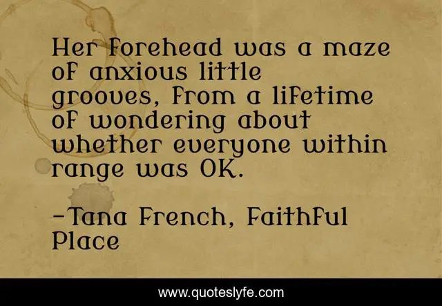 This page presents the quote "Her forehead was a maze of anxious little grooves, from a lifetime of wondering about whether everyone within range was OK.". Author of this quote is Tana French, Faithful Place. This quote is about anxiety, love, worry, affection,.