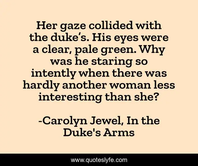 This page presents the quote "Her gaze collided with the duke’s. His eyes were a clear, pale green. Why was he staring so intently when there was hardly another woman less interesting than she?". Author of this quote is Carolyn Jewel, In the Duke's Arms. This quote is about romance, historical-romance,.