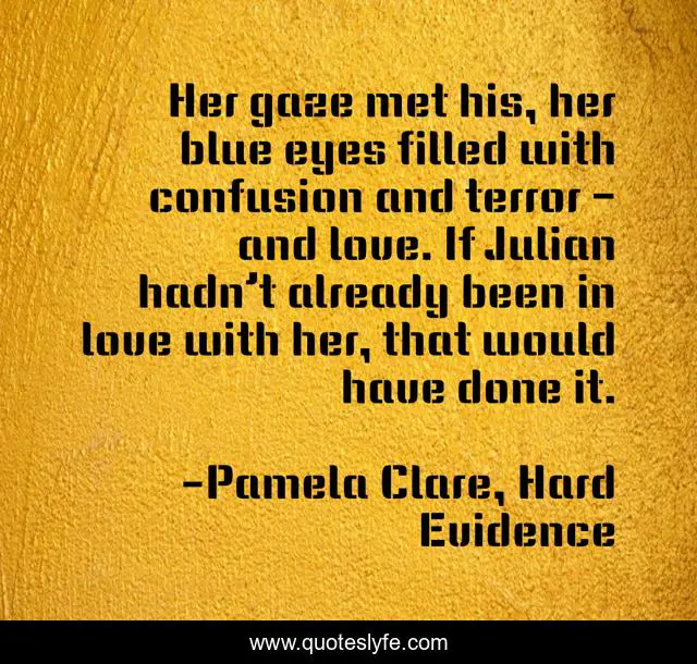 This page presents the quote "Her gaze met his, her blue eyes filled with confusion and terror – and love. If Julian hadn’t already been in love with her, that would have done it.". Author of this quote is Pamela Clare, Hard Evidence. This quote is about romance, love, affection, romantic-suspense,.