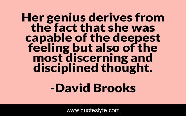 This page presents the quote "Her genius derives from the fact that she was capable of the deepest feeling but also of the most discerning and disciplined thought.". Author of this quote is David Brooks. This quote is about self-discipline, passion,.