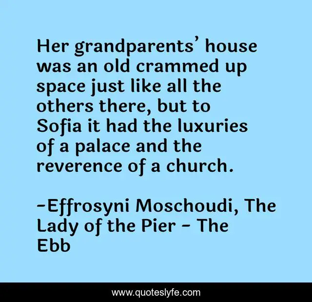 This page presents the quote "Her grandparents’ house was an old crammed up space just like all the others there, but to Sofia it had the luxuries of a palace and the reverence of a church.". Author of this quote is Effrosyni Moschoudi, The Lady of the Pier - The Ebb. This quote is about memories, love, nostalgia, affection,.
