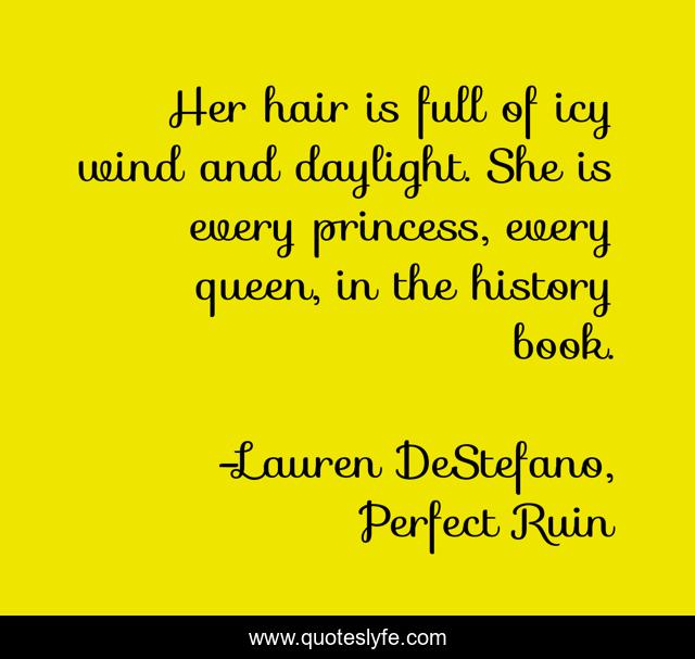 This page presents the quote "Her hair is full of icy wind and daylight. She is every princess, every queen, in the history book.". Author of this quote is Lauren DeStefano, Perfect Ruin. This quote is about beautiful, queen, royalty, princess,.
