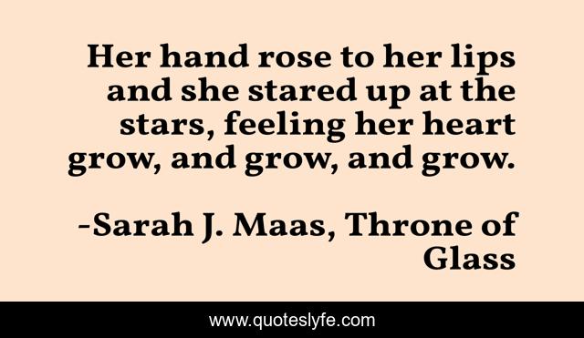This page presents the quote "Her hand rose to her lips and she stared up at the stars, feeling her heart grow, and grow, and grow.". Author of this quote is Sarah J. Maas, Throne of Glass. This quote is about heart, love, stars, affection, celaena-sardothien,.