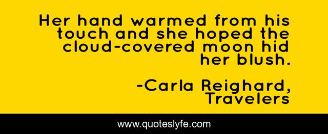 This page presents the quote "Her hand warmed from his touch and she hoped the cloud-covered moon hid her blush.". Author of this quote is Carla Reighard, Travelers. This quote is about romance, fantasy, love, affection,.