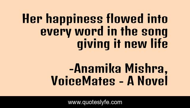 This page presents the quote "Her happiness flowed into every word in the song giving it new life". Author of this quote is Anamika Mishra, VoiceMates - A Novel. This quote is about love, life, music, voicemates, affection,.