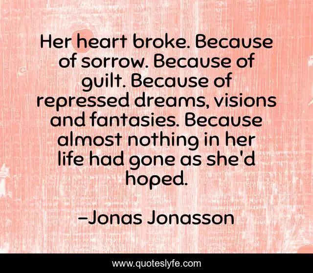This page presents the quote "Her heart broke. Because of sorrow. Because of guilt. Because of repressed dreams, visions and fantasies. Because almost nothing in her life had gone as she'd hoped.". Author of this quote is Jonas Jonasson. .