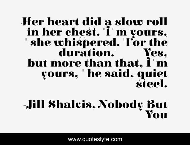 This page presents the quote "Her heart did a slow roll in her chest. "I'm yours, " she whispered. "For the duration." "Yes, but more than that, I'm yours, " he said, quiet steel.". Author of this quote is Jill Shalvis, Nobody But You. .