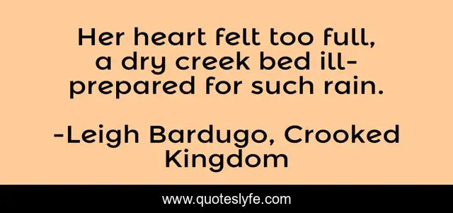 This page presents the quote "Her heart felt too full, a dry creek bed ill-prepared for such rain.". Author of this quote is Leigh Bardugo, Crooked Kingdom. This quote is about heart, creek, crooked-kingdom, joy, glee, rain, water, inej-ghafa, six-of-crows,.