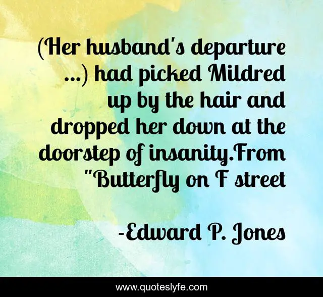 This page presents the quote "(Her husband's departure ...) had picked Mildred up by the hair and dropped her down at the doorstep of insanity.From "Butterfly on F street". Author of this quote is Edward P. Jones. This quote is about insane, loss, madness, relationships, betrayal, insanity,.