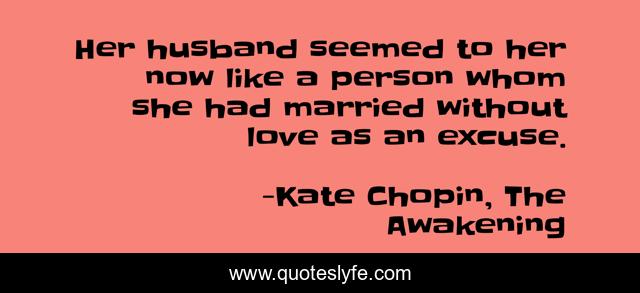 This page presents the quote "Her husband seemed to her now like a person whom she had married without love as an excuse.". Author of this quote is Kate Chopin, The Awakening. This quote is about freedom, restraint, women,.