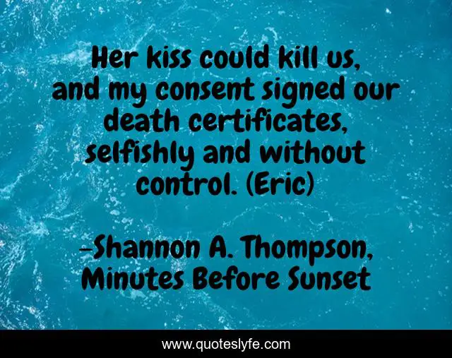 This page presents the quote "Her kiss could kill us, and my consent signed our death certificates, selfishly and without control. (Eric)". Author of this quote is Shannon A. Thompson, Minutes Before Sunset. This quote is about selfish, death, fiction, romance, young-love, kiss, young-adult, paranormal-romance, uncontrollable,.