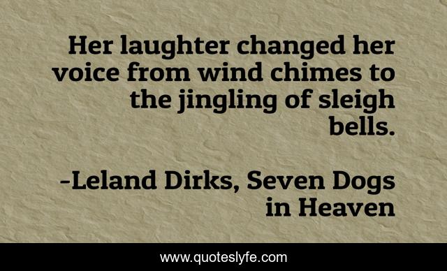 This page presents the quote "Her laughter changed her voice from wind chimes to the jingling of sleigh bells.". Author of this quote is Leland Dirks, Seven Dogs in Heaven. This quote is about voice, laughter, bells,.