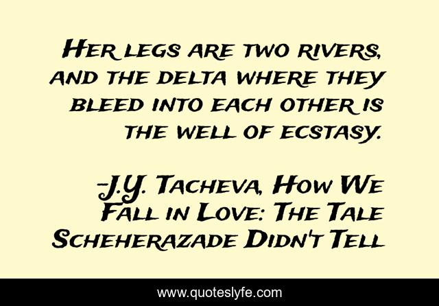 This page presents the quote "Her legs are two rivers, and the delta where they bleed into each other is the well of ecstasy.". Author of this quote is J.Y. Tacheva, How We Fall in Love: The Tale Scheherazade Didn't Tell. This quote is about lovers, love, affection,.