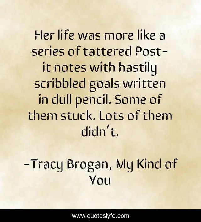 This page presents the quote "Her life was more like a series of tattered Post-it notes with hastily scribbled goals written in dull pencil. Some of them stuck. Lots of them didn’t.". Author of this quote is Tracy Brogan, My Kind of You. This quote is about small-town-romance, contemporary-romance,.