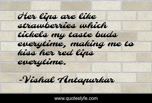 This page presents the quote "Her lips are like strawberries which tickels my taste buds everytime, making me to kiss her red lips everytime.". Author of this quote is Vishal Antapurkar. This quote is about lips, strawberries, kiss,.