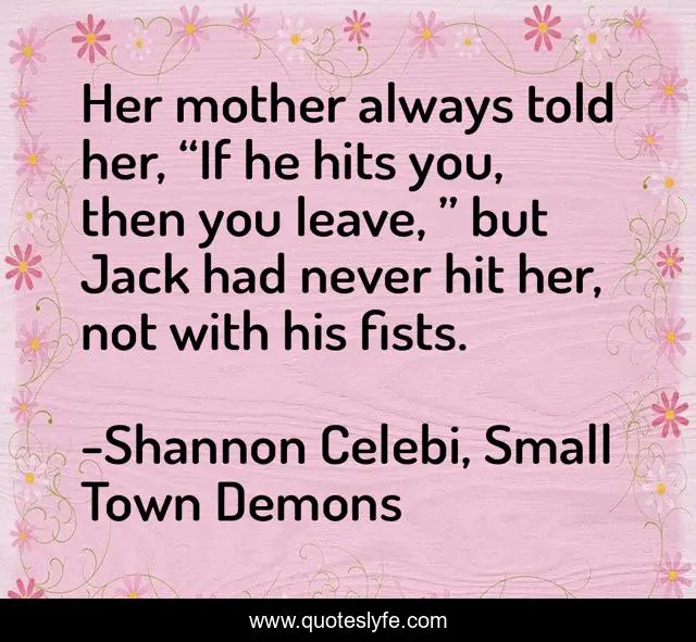 This page presents the quote "Her mother always told her, “If he hits you, then you leave, ” but Jack had never hit her, not with his fists.". Author of this quote is Shannon Celebi, Small Town Demons. This quote is about verbal-attack, women-s-rights, abuse, spousal-abuse, verbal-abuse, mental-abuse,.