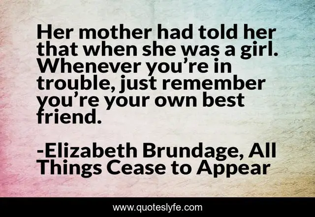 This page presents the quote "Her mother had told her that when she was a girl. Whenever you’re in trouble, just remember you’re your own best friend.". Author of this quote is Elizabeth Brundage, All Things Cease to Appear. This quote is about friendship, mother,.