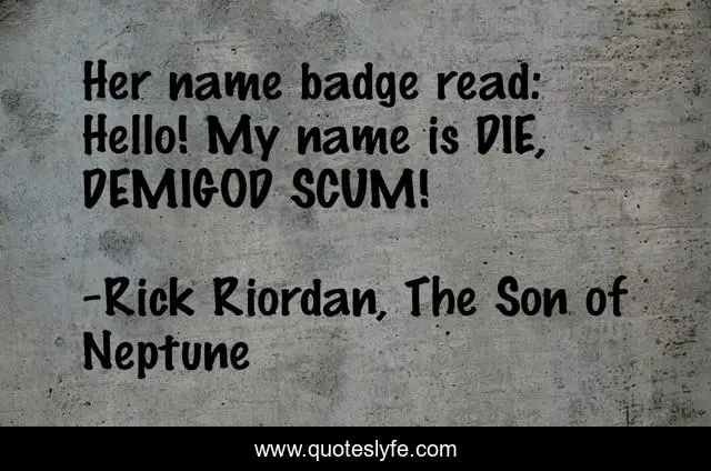 This page presents the quote "Her name badge read: Hello! My name is DIE, DEMIGOD SCUM!". Author of this quote is Rick Riordan, The Son of Neptune. This quote is about funny, die-demigod-scum, humor, laugh-out-loud, random, name-badge, the-son-of-neptune, hilarious, rick-riordan,.