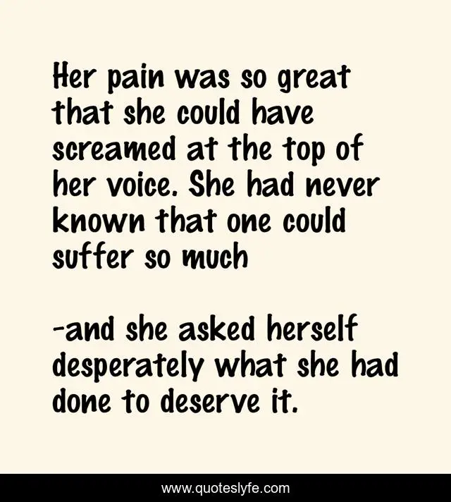 "and she asked herself desperately what she had done to deserve it. Quotes." Quoteslyfe.com, 2025. Mon. 08 Dec. 2025. <https://www.quoteslyfe.com/quote/Her-pain-was-so-great-that-she-75794>.