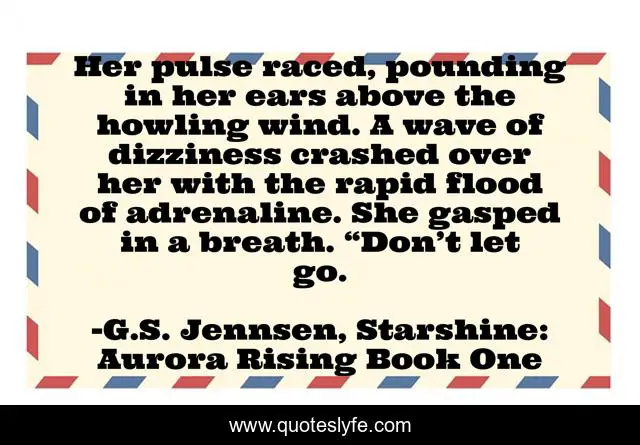 This page presents the quote "Her pulse raced, pounding in her ears above the howling wind. A wave of dizziness crashed over her with the rapid flood of adrenaline. She gasped in a breath. “Don’t let go.". Author of this quote is G.S. Jennsen, Starshine: Aurora Rising Book One. This quote is about alex-solovy, science-fiction-romance, science-fiction, romance, space-opera, adventure, caleb-marano,.