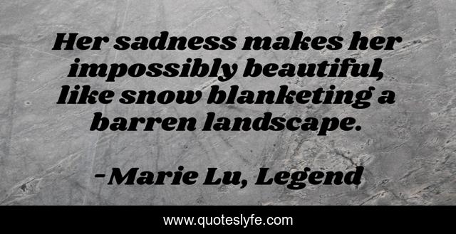 This page presents the quote "Her sadness makes her impossibly beautiful, like snow blanketing a barren landscape.". Author of this quote is Marie Lu, Legend. This quote is about beautiful, june, day, snow,.