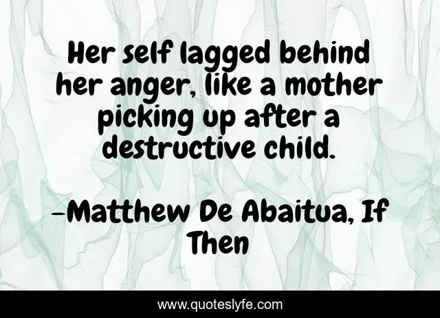 This page presents the quote "Her self lagged behind her anger, like a mother picking up after a destructive child.". Author of this quote is Matthew De Abaitua, If Then. This quote is about anger, simile,.