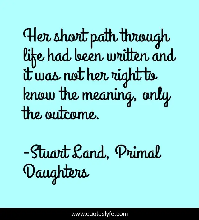 This page presents the quote "Her short path through life had been written and it was not her right to know the meaning, only the outcome.". Author of this quote is Stuart Land, Primal Daughters. This quote is about path-of-life, life, destiny, written, the-meaning-of-life, short-life, path, outcome,.