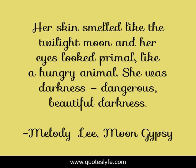 This page presents the quote "Her skin smelled like the twilight moon and her eyes looked primal, like a hungry animal. She was darkness – dangerous, beautiful darkness.". Author of this quote is Melody Lee, Moon Gypsy. This quote is about beauty, love, darkness, affection, poetry,.
