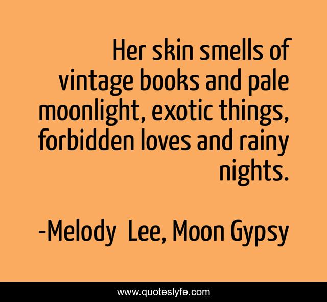 This page presents the quote "Her skin smells of vintage books and pale moonlight, exotic things, forbidden loves and rainy nights.". Author of this quote is Melody Lee, Moon Gypsy. This quote is about moonlight, forbidden-love, books, poetry, vintage-books,.