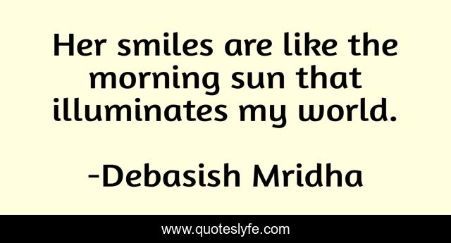 This page presents the quote "Her smiles are like the morning sun that illuminates my world.". Author of this quote is Debasish Mridha. This quote is about smiles, inspirational, philosophy, debasish-mridha, quotes, morning-sun, illuminates-my-world, enthusiasm, her-smiles,.