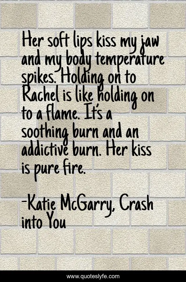 This page presents the quote "Her soft lips kiss my jaw and my body temperature spikes. Holding on to Rachel is like holding on to a flame. It’s a soothing burn and an addictive burn. Her kiss is pure fire.". Author of this quote is Katie McGarry, Crash into You. This quote is about fire, addictive, isaiah, kiss, rachel-young,.