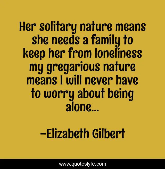 This page presents the quote "Her solitary nature means she needs a family to keep her from loneliness my gregarious nature means I will never have to worry about being alone...". Author of this quote is Elizabeth Gilbert. This quote is about pray, love, eat, affection,.