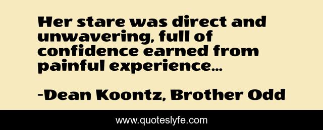 This page presents the quote "Her stare was direct and unwavering, full of confidence earned from painful experience...". Author of this quote is Dean Koontz, Brother Odd. This quote is about confidence, pain, experiences, flossie-bodenblatt, perseverence, odd-thomas,.