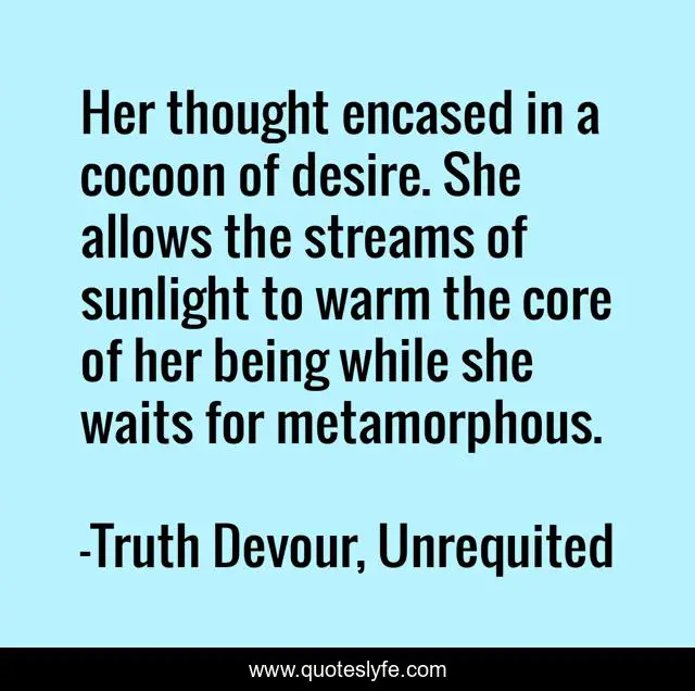 This page presents the quote "Her thought encased in a cocoon of desire. She allows the streams of sunlight to warm the core of her being while she waits for metamorphous.". Author of this quote is Truth Devour, Unrequited. This quote is about faith, love, kindred-spirits, joy, karmic, soul, romance, twin-flames, sated,.