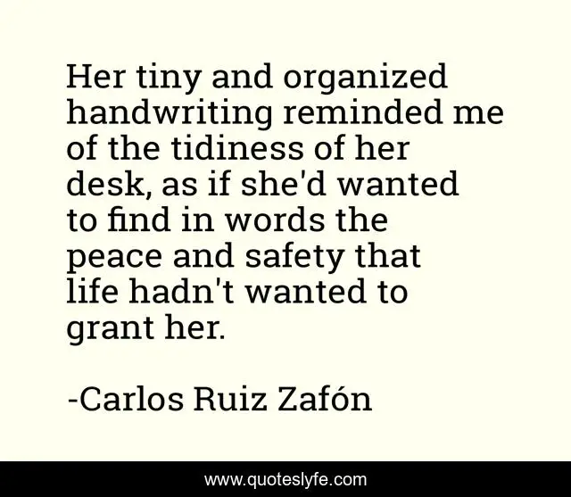 "Carlos Ruiz Zafón Quotes." Quoteslyfe.com, 2025. Sat. 06 Dec. 2025. <https://www.quoteslyfe.com/quote/Her-tiny-and-organized-handwriting-reminded-me-279954>.