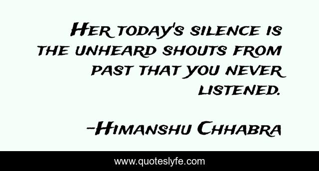 This page presents the quote "Her today's silence is the unheard shouts from past that you never listened.". Author of this quote is Himanshu Chhabra. This quote is about past, emotions, feelings, shouts, broken, present, silence,.