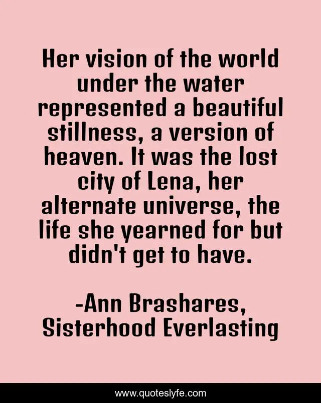 This page presents the quote "Her vision of the world under the water represented a beautiful stillness, a version of heaven. It was the lost city of Lena, her alternate universe, the life she yearned for but didn't get to have.". Author of this quote is Ann Brashares, Sisterhood Everlasting. This quote is about beautiful, heaven, alternate-universe, water, yearning, stillness, world, lost-city, vision,.
