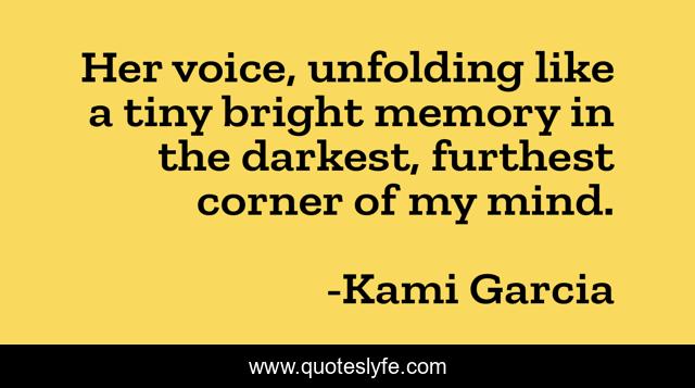 This page presents the quote "Her voice, unfolding like a tiny bright memory in the darkest, furthest corner of my mind.". Author of this quote is Kami Garcia. This quote is about love, beautiful-creatures, magic, love-story, affection,.