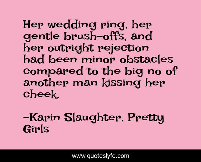 This page presents the quote "Her wedding ring, her gentle brush-offs, and her outright rejection had been minor obstacles compared to the big no of another man kissing her cheek.". Author of this quote is Karin Slaughter, Pretty Girls. This quote is about friend-zone, rejection, feminism, feminist,.