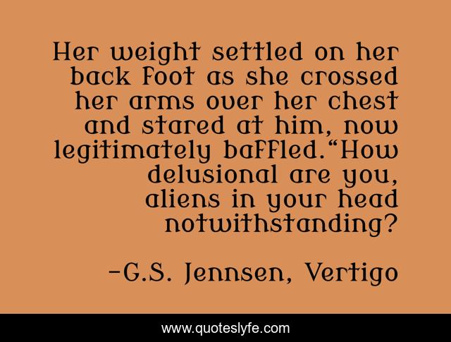 This page presents the quote "Her weight settled on her back foot as she crossed her arms over her chest and stared at him, now legitimately baffled.“How delusional are you, aliens in your head notwithstanding?". Author of this quote is G.S. Jennsen, Vertigo. This quote is about alien-invasion, space-opera, adventure, science-fiction,.