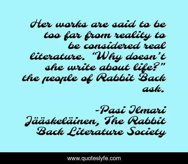 This page presents the quote "Her works are said to be too far from reality to be considered real literature. “Why doesn’t she write about life?” the people of Rabbit Back ask.". Author of this quote is Pasi Ilmari Jääskeläinen, The Rabbit Back Literature Society. This quote is about write, life, literature,.