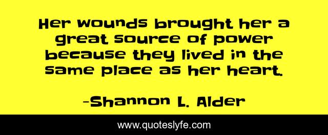This page presents the quote "Her wounds brought her a great source of power because they lived in the same place as her heart.". Author of this quote is Shannon L. Alder. This quote is about true-love, strength, love, survivor, lessons-learned, grief, courage, victim, fortitude,.