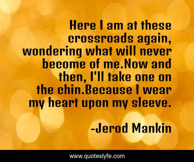 This page presents the quote "Here I am at these crossroads again, wondering what will never become of me.Now and then, I'll take one on the chin.Because I wear my heart upon my sleeve.". Author of this quote is Jerod Mankin. This quote is about heart, crossroads, bobaflex, sing,.