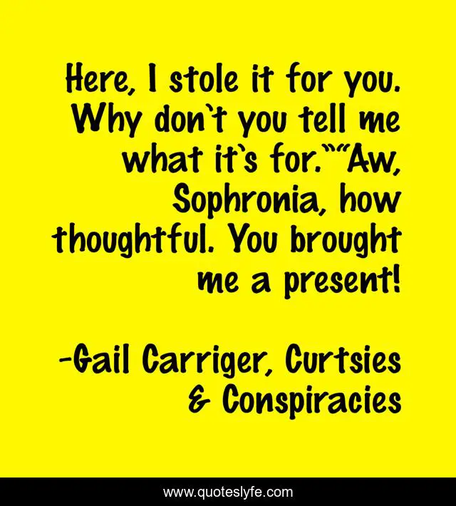 This page presents the quote "Here, I stole it for you. Why don’t you tell me what it’s for.”“Aw, Sophronia, how thoughtful. You brought me a present!". Author of this quote is Gail Carriger, Curtsies & Conspiracies. This quote is about spies, humor, present, stealing,.