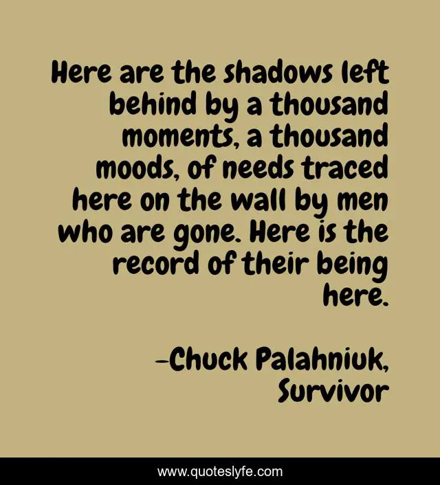 "Chuck Palahniuk, Survivor Quotes." Quoteslyfe.com, 2025. Sat. 06 Dec. 2025. <https://www.quoteslyfe.com/quote/Here-are-the-shadows-left-behind-by-251368>.