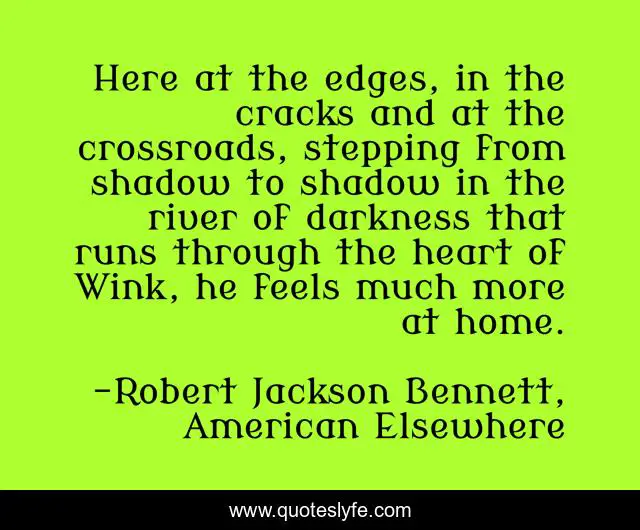 This page presents the quote "Here at the edges, in the cracks and at the crossroads, stepping from shadow to shadow in the river of darkness that runs through the heart of Wink, he feels much more at home.". Author of this quote is Robert Jackson Bennett, American Elsewhere. This quote is about darkness, crossroads,.