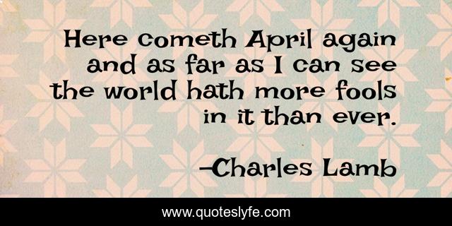 This page presents the quote "Here cometh April again and as far as I can see the world hath more fools in it than ever.". Author of this quote is Charles Lamb. This quote is about fools, foolishness,.